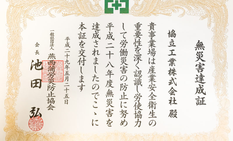 燕西蒲労災防止協会から昨年度無災害を達成した賞状を頂きました。